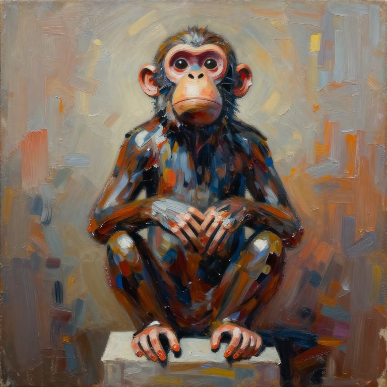 Existence abstract painting brushstrokes by Jeremy Mann evil monkey statue, hands and feet cupped facing upwards,