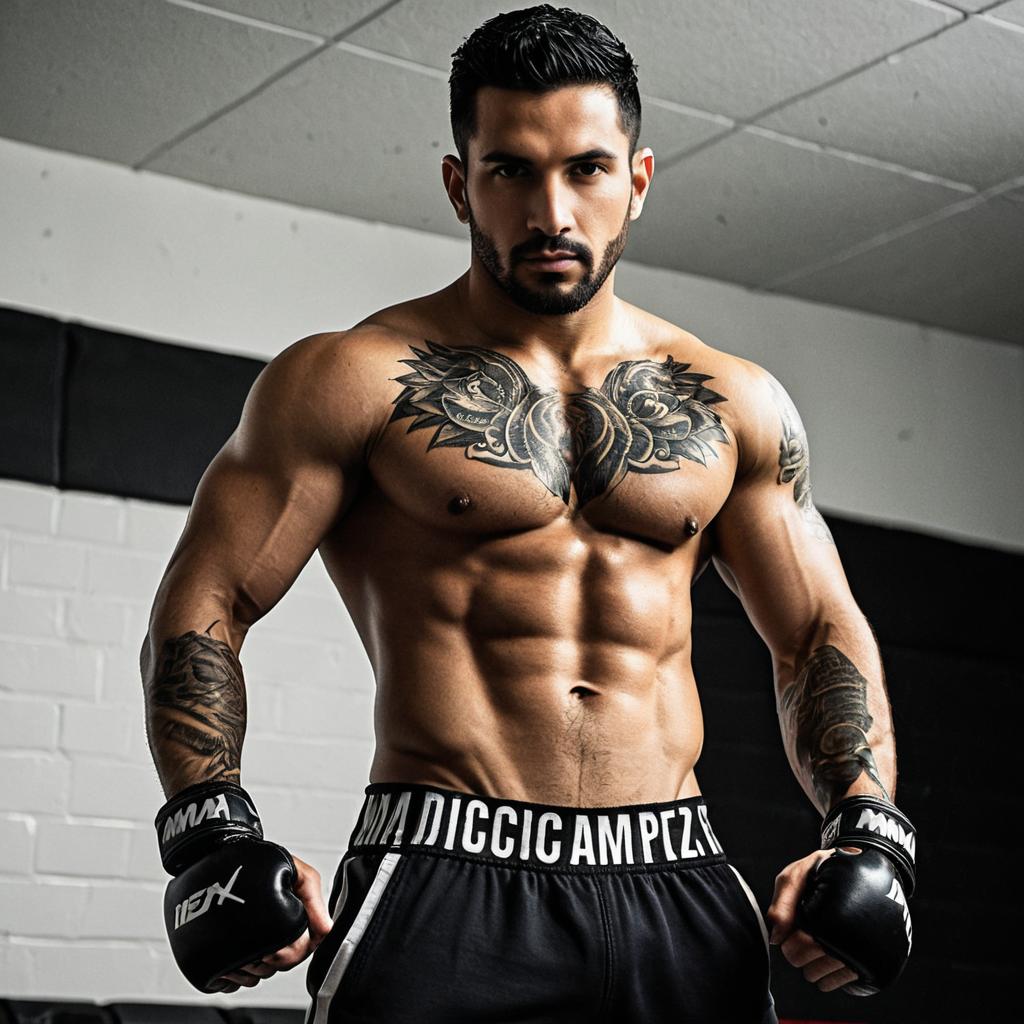 Portrait of a muscular male MMA fighter standing shirtless in a gym setting. The man has short black hair, facial hair, and prominent tattoos on his chest and arms. He is wearing black MMA shorts and black MMA gloves, displaying a strong and intense pose while looking directly at the camera.