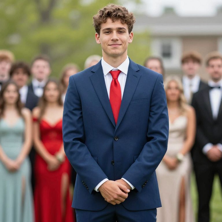 Prom Suits, dressed in a blue suit and red tie standing in front of a crowd