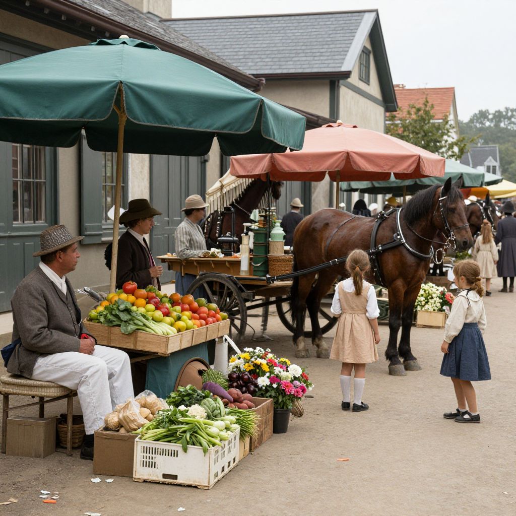 1910 street market scene with vendors selling fresh fruits, vegetables, and flowers, children playing nearby, horses pulling carts, colorful awnings and bustling crowd in period clothing, bright daylight highlighting intricate textures and lively atmosphere