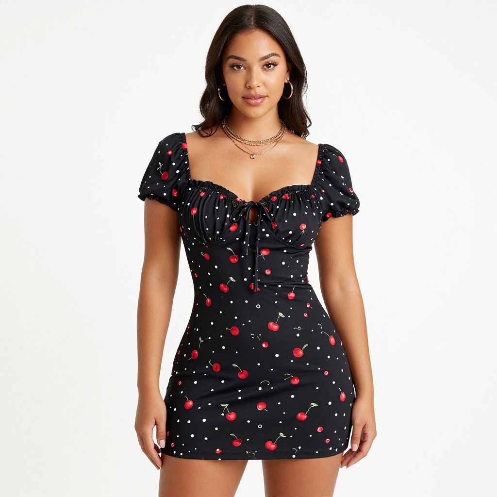 "Woman, retro-inspired, black mini dress with red cherry print, polka dots, sweetheart neckline, short puff sleeves, front tie detail, fitted silhouette, thigh-length, gold hoop earrings, layered necklaces, white background.. Sexy. Pretty face and beаutiful eyes. Big breasts."