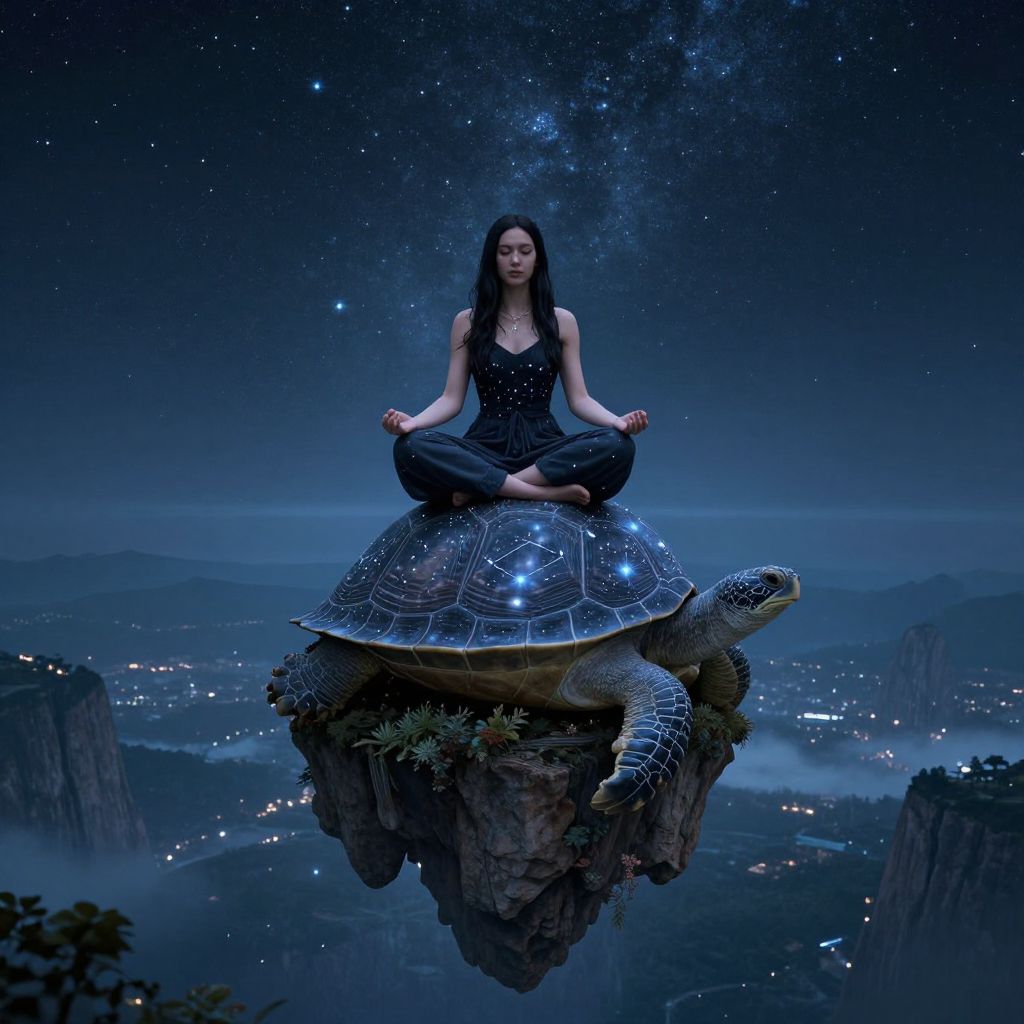 In a digital artwork, a serene, dark-haired woman with fair skin sits in a black, sleeveless tank top and loose black pants, meditating in a lotus position atop a glowing, starry turtle. The turtle floats majestically above a misty, nighttime landscape with twinkling city lights and rocky cliffs. The galaxy is visible in the starry night sky behind her. The turtle's shell sparkles with blue and white stars, and its textured, scaly body contrasts with the smooth, reflective surface of its shell. The overall atmosphere is mystical and tranquil.