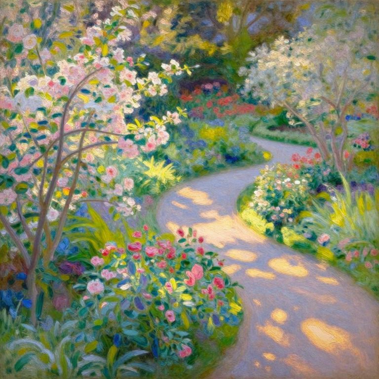 Vibrant, impressionist-style painting of a sunlit garden path winding through colorful blooming flowers, with soft, dappled light and lush