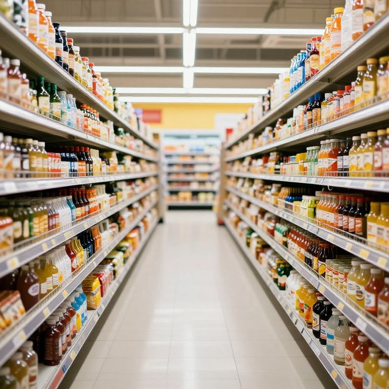 A mesmerizing grocery aisle where identical products seamlessly blend into an endless, hypnotic pattern, defying the boundaries of repetition and reality.