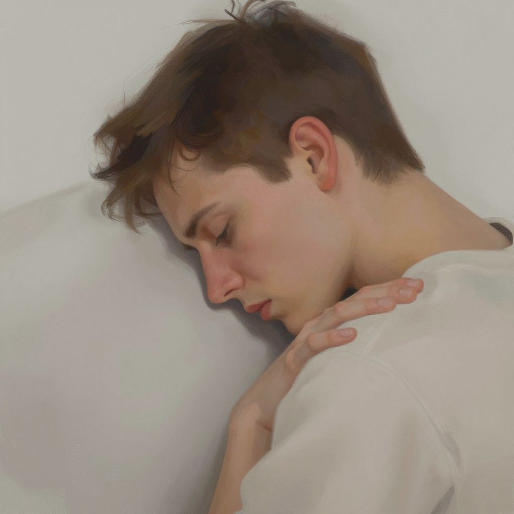 A digital painting depicts a young man with short, tousled brown hair and fair skin, sleeping on a white pillow. He wears a loose, white shirt and rests his head on his right hand, which is gently touching his shoulder. His eyes are closed, and his expression is peaceful. The background is a plain, soft white, emphasizing the serene, calm mood of the scene. The painting uses smooth, realistic brushstrokes with subtle shading to convey a sense of tranquility and restfulness.