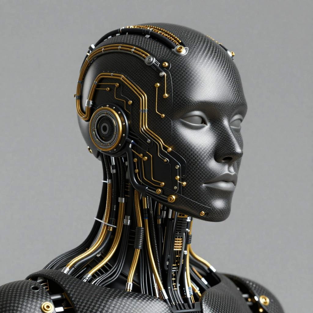 Half human half robot name characterized by a humanoid figure with robotic limbs and intricate circuitry visible beneath translucent skin, set against a backdrop of a post-apocalyptic world, symbolizing survival and evolution, detailed textures and dramatic lighting.