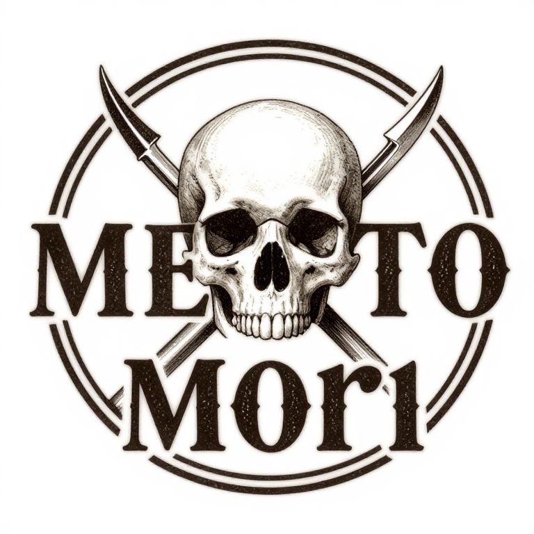 Memento mori logo composed of a circular frame enclosing a skull and crossed scythes, textured antique look, bold serif lettering, monochrome with slight sepia tint, vintage engraving feel