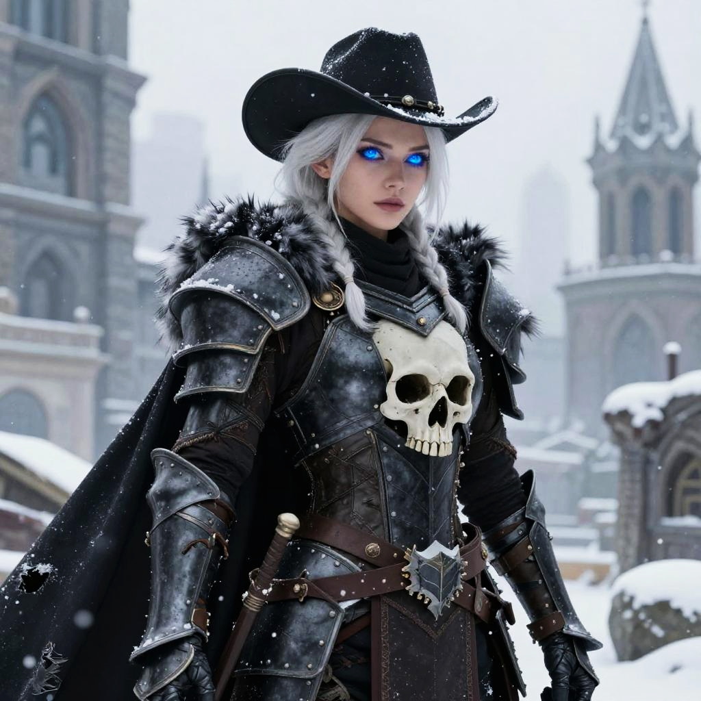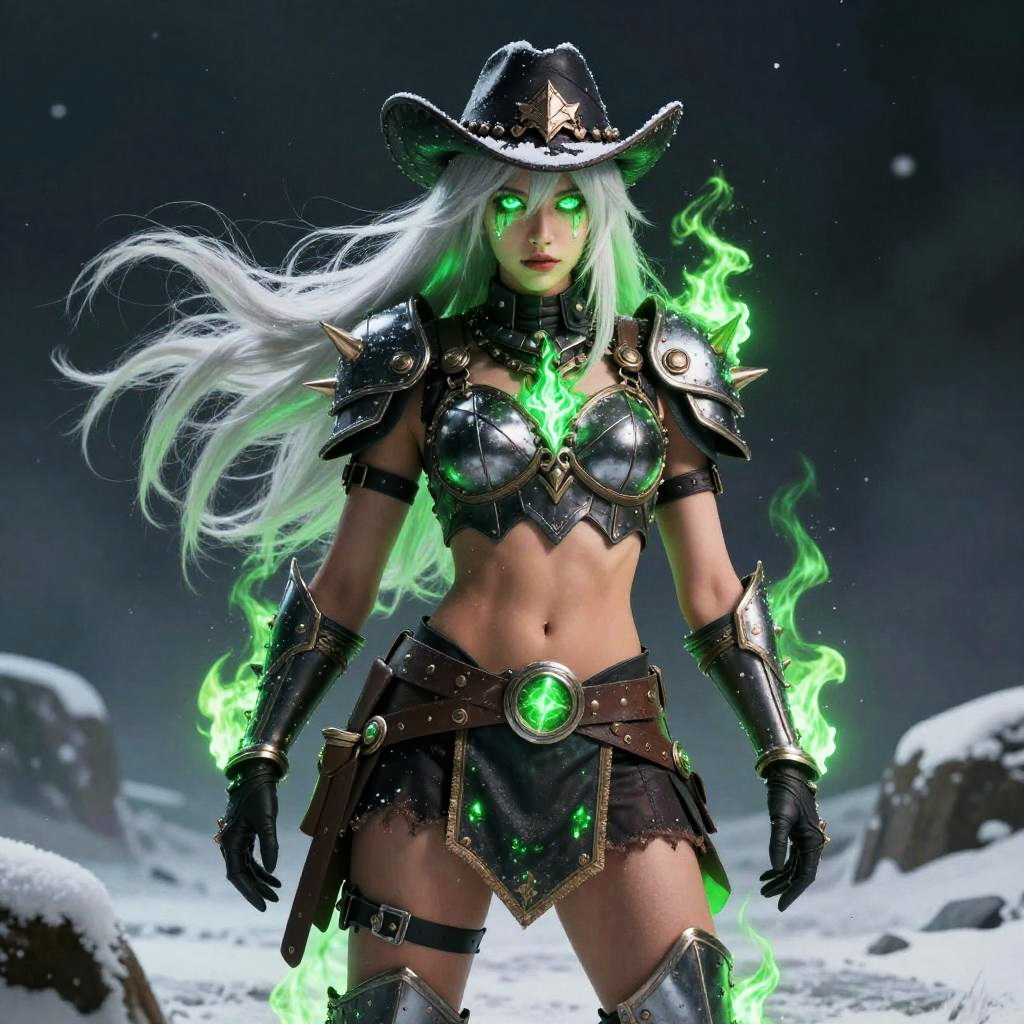 Photorealistic CGI image of a fierce, pale-skinned woman with glowing green eyes and long, flowing white hair. She wears a black cowboy hat, black metallic armor with glowing green accents, and a leather loincloth with a green gem. Her arms and shoulders are adorned with spiked, glowing green flames. She stands in a snowy landscape with dark, cloudy skies. Her confident, powerful stance and the intricate details of her armor highlight a fantasy warrior aesthetic. The image emphasizes her otherworldly, magical abilities with neon-green elements contrasting against the cold, snowy background.