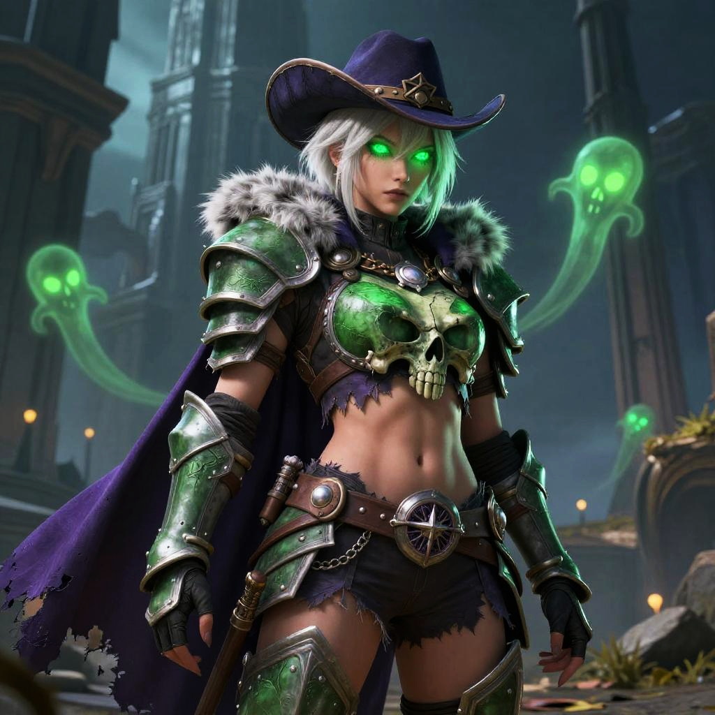 Digital artwork of a white-haired, green-eyed warrior woman with glowing green flames, wearing black armor, a cowboy hat, and a green gem belt,
