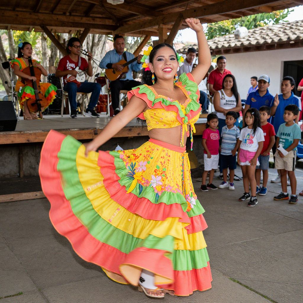 A well-lit, candid-style photo of a stunning Colombian woman dancing in a vibrant cumbia costume, her flowing skirt in tropical colors like coral pink, green, and sunshine yellow fluttering as she moves to traditional music, set in a lively village courtyard with a wooden stage, local children watching curiously, her face glowing with cultural pride and warmth. The woman has big tits and cute face