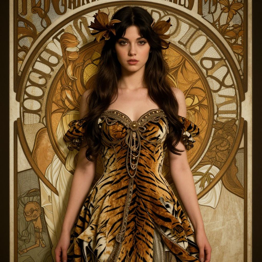 A hyperrealistic, cinematic image of a young woman in a tiger print gown, with intricate details and dramatic lighting, reminiscent of James Jean and Alphonse Mucha's styles.