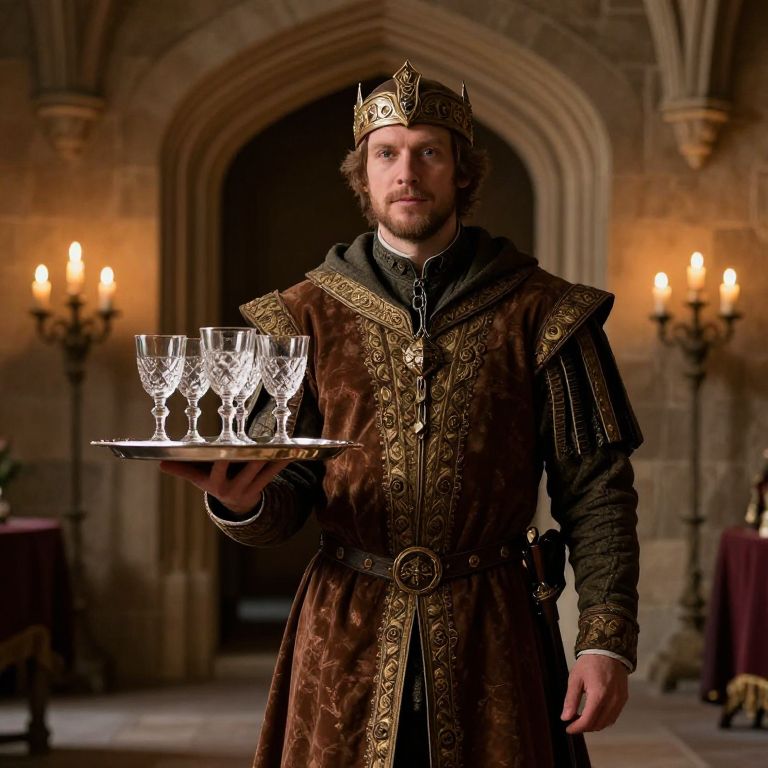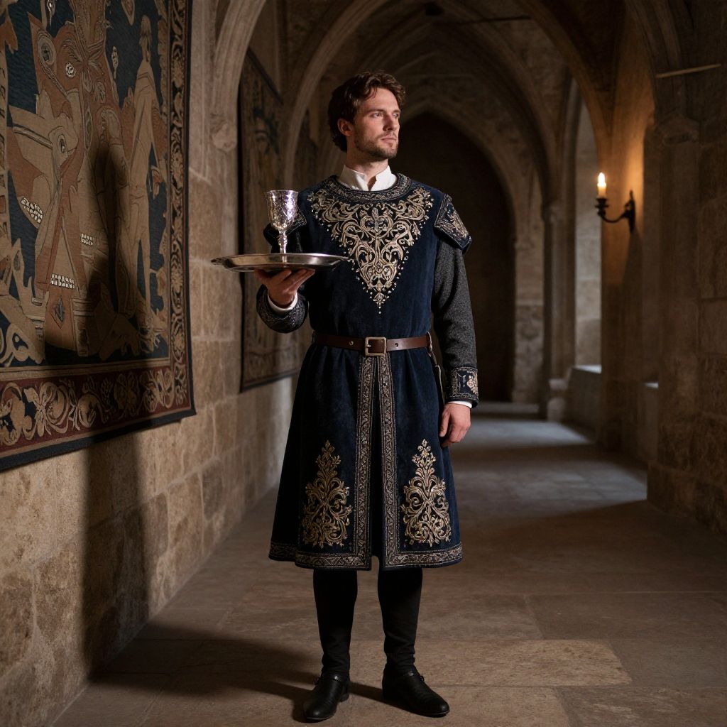 Footman in a medieval castle hallway, wearing a traditional livery with intricate embroidery, holding a silver tray with a goblet, dim candlelight casting soft shadows, stone walls adorned with tapestries in the background, atmosphere of quiet duty and elegance.