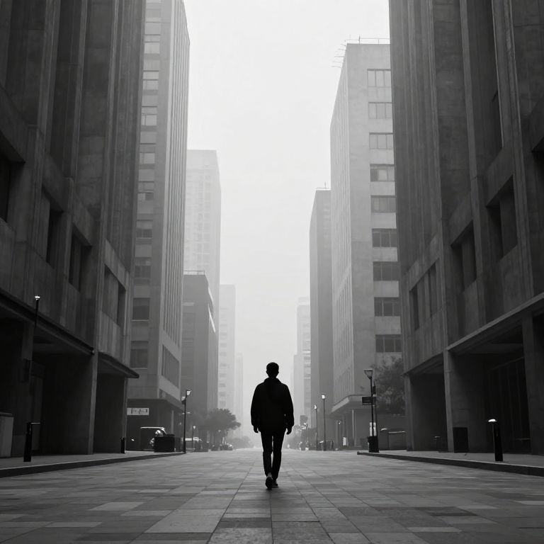 Silhouetted figure walks alone down a vast, monochromatic urban canyon, flanked by towering concrete structures that fade into a hazy, ethereal horizon.