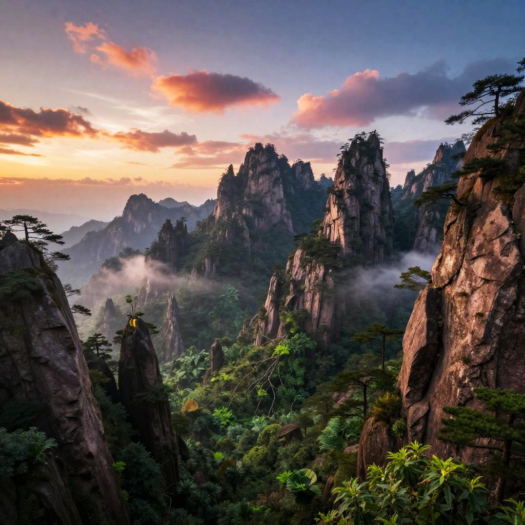 Awe inspiring landscapes showcasing towering mountain ranges at sunrise, vibrant colors painting the sky, lush green valleys below, and mist swirling around ancient trees, hyper-realistic style