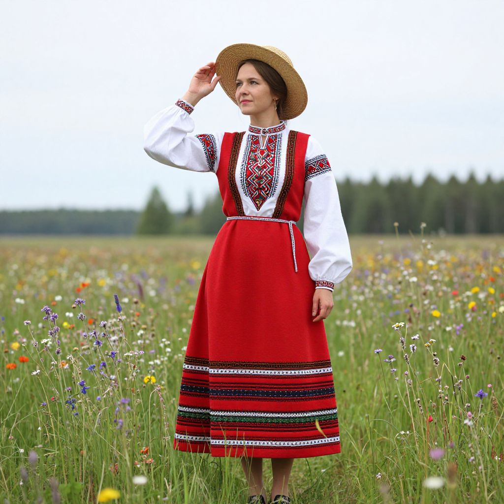 Photograph of a young woman in traditional Eastern European dress, standing in a colorful meadow, wearing a straw hat, white blouse, and red skirt