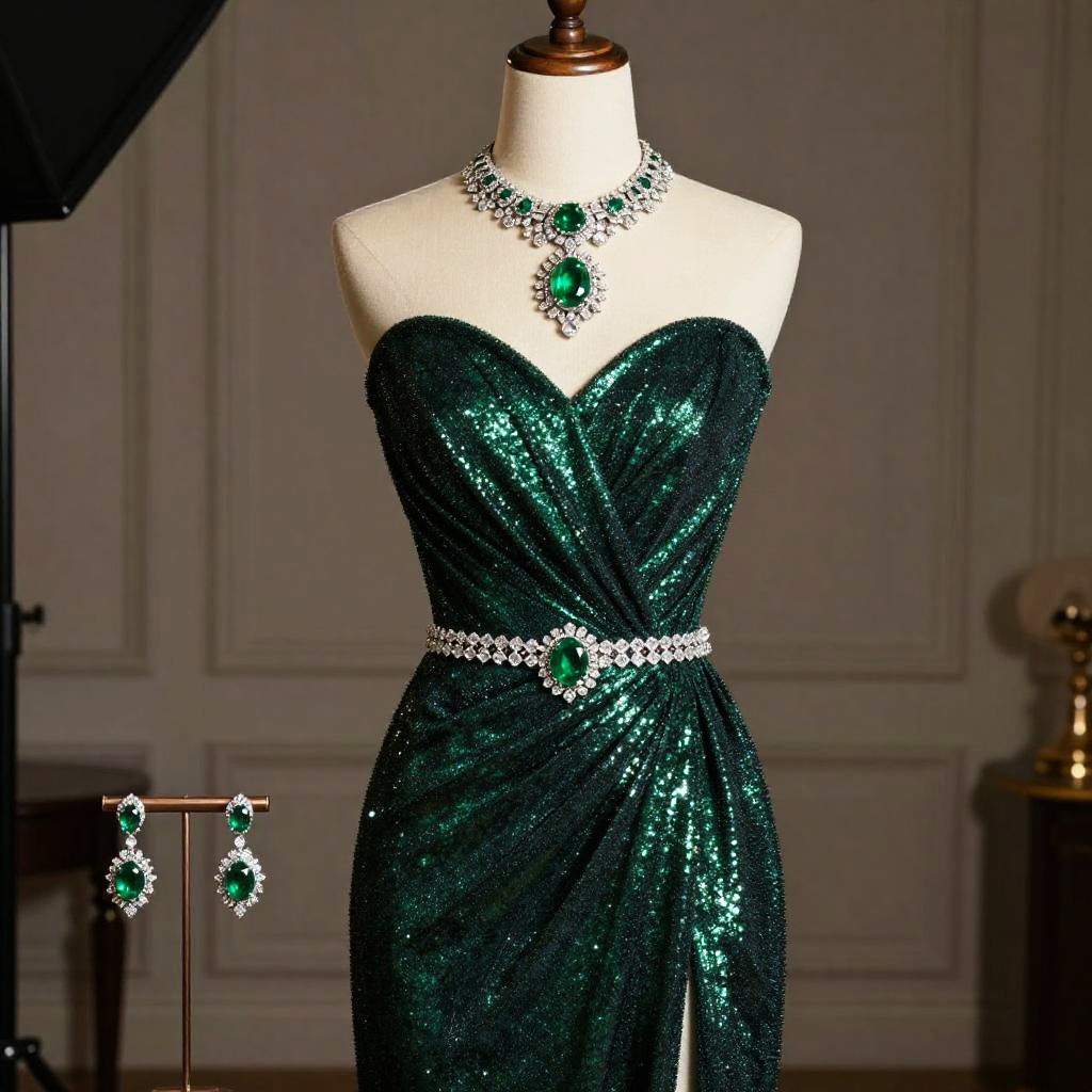 Emerald green dress jewelry set, luxurious evening gown shimmering under soft lighting, adorned with sparkling diamond and emerald accessories, elegant and sophisticated atmosphere, high fashion editorial style, detailed textures and rich colors.