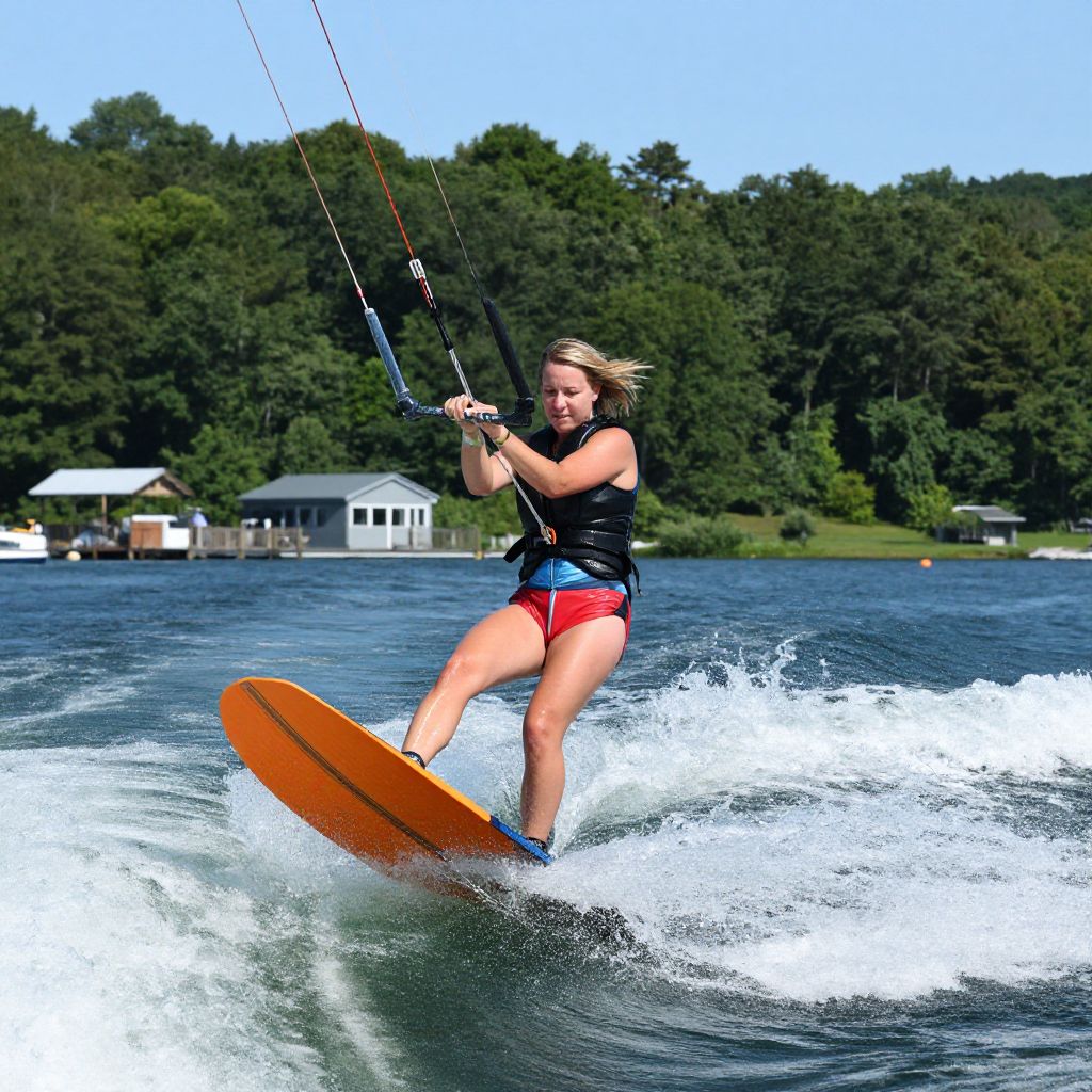 Woman wakeboarding on Smith Mountain Lake, skillfully gliding over the water near Bridgewater Marina with vibrant orange board and red shorts, while holding onto a kite control bar connected by multiple lines against a backdrop of lush green trees and a clear blue sky.