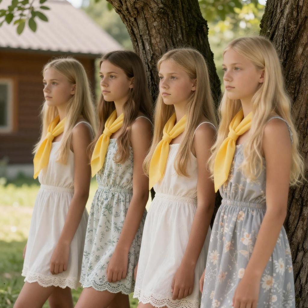Four blonde girls with long hair, wearing light-colored floral dresses and a yellow scarf, stand in a sunlit outdoor setting. They lean against a tree trunk. Three girls are in profile, one faces forward. All have neutral expressions. Background includes a wooden house and greenery.