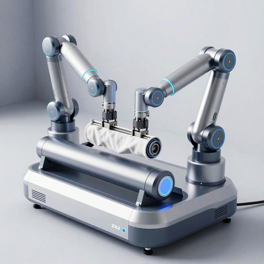 Cloths remover device concept, sleek futuristic machine designed for efficiently removing clothes with robotic arms, metallic and plastic textures, clean tech environment, soft lighting, hyper-realistic style with detailed mechanisms, modern color palette