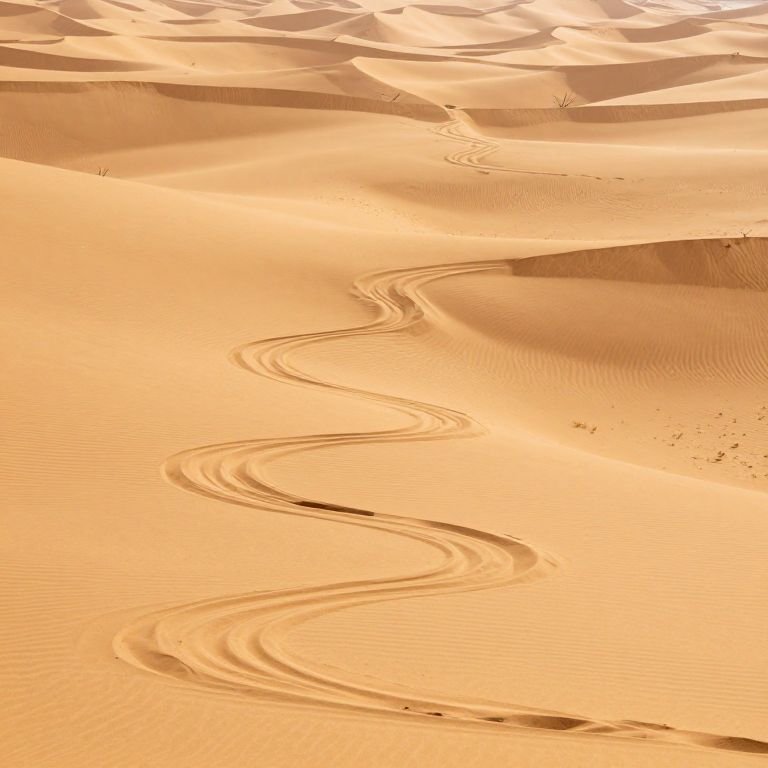 Photograph of a golden desert with swirling tire tracks winding through undulating sand dunes under bright sunlight, casting soft shadows.