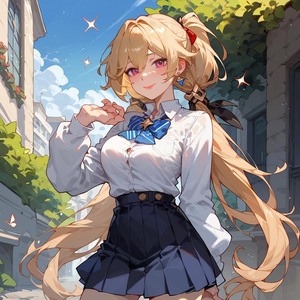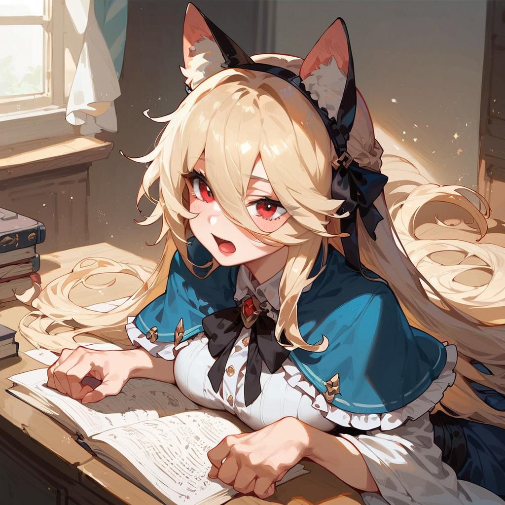 Score_9, score_8_up, score_7_up, score_6_up, score_5_up, score_4_up, source_anime, Roll (Mega man), android, long hair, blush, bangs, blonde hair, long sleeves, green eyes, hair ribbon, ponytail, sidelocks, boots, frills, red skirt, red dress, frilled dress, knee boots, red footwear, outline, green ribbon, undershirt, 1girl, solo, sitting, smile, :o, dynamic angle, indoors, science, chair, table, looking at the pc