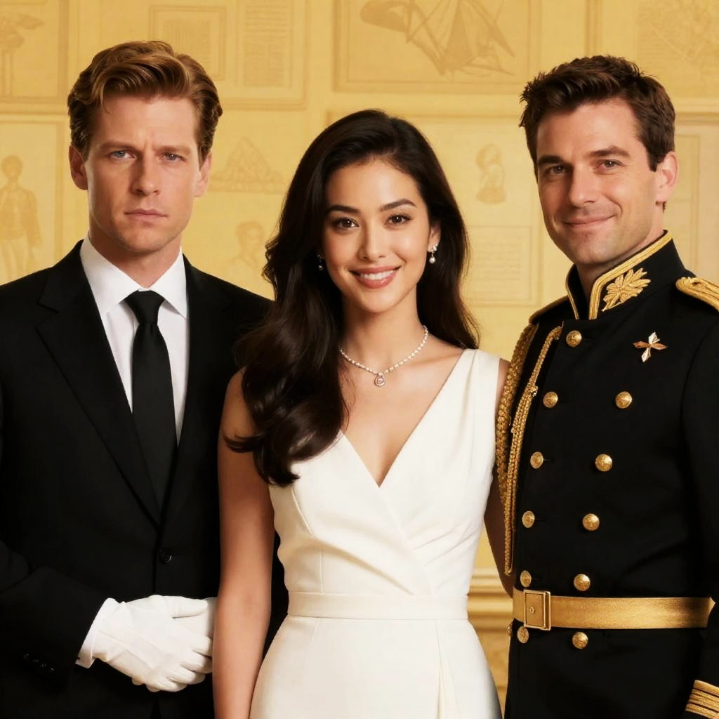Photograph of a formal event. A brunette woman in a strapless, bright blue dress sits in the foreground, smiling. Surrounding her are men in black suits and white shirts, seated and standing. Background includes blurred lights and a brick wall. The woman's elegant dress contrasts with the men's formal attire.