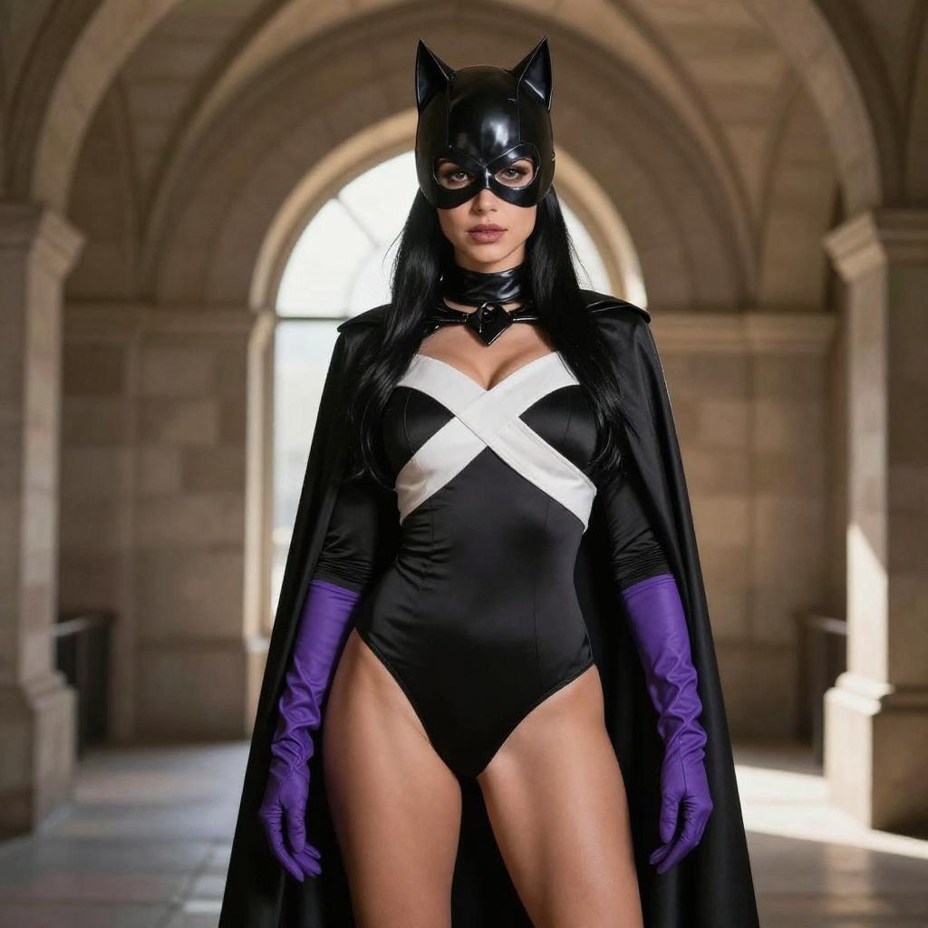 Photograph of a woman in a black and white catwoman costume with purple gloves, mask, and cape. She has long black hair, a white cross-shaped chest piece, and black high-cut bottoms. She stands in a dimly lit, arched stone building with sunlight streaming in from behind her.