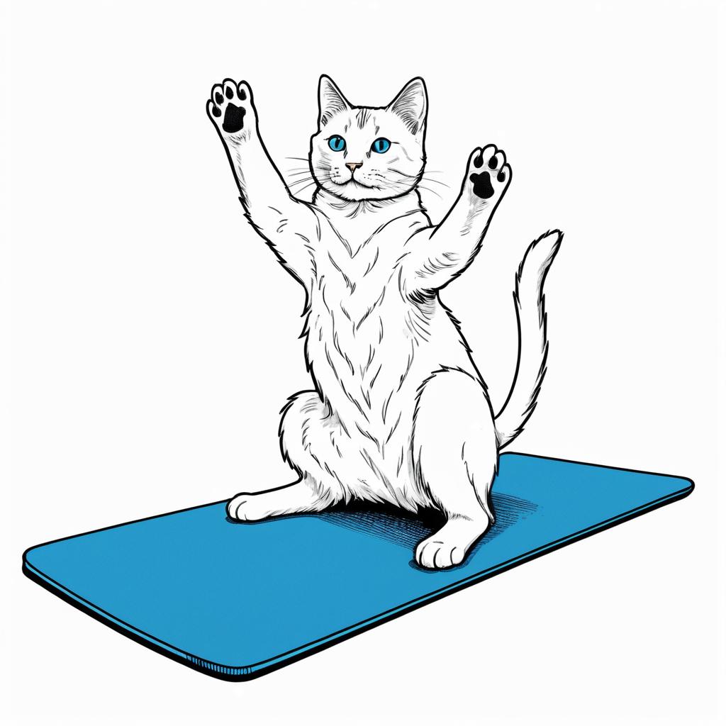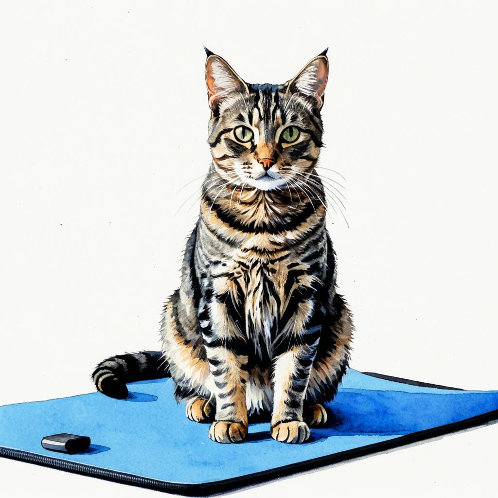 Chubby Grey Tabby Cat Sitting on Yoga Mat