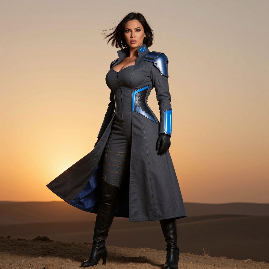 Photograph of a confident, dark-haired woman standing in a desert at sunset. She wears a form-fitting, long black coat with blue metallic accents on the shoulders and sleeves, and black leather gloves and boots. The coat has a deep V-neck, highlighting her cleavage. Her expression is intense, and her stance is strong. The background features a gradient sky from orange to pale yellow, with distant, shadowy dunes. The lighting emphasizes the contrast between her dark outfit and the warm sunset. The image has a slightly dramatic, superhero-like style.