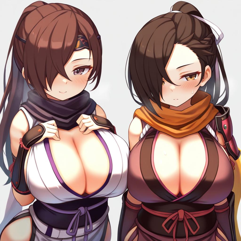 Kagero (fire emblem), fire emblem, 1girl, brown eyes, hair over one eye, brown hair, long hair, ponytail, large breasts, cleavage, ninja, by artist chii (tsumami tsumamare), illustrious