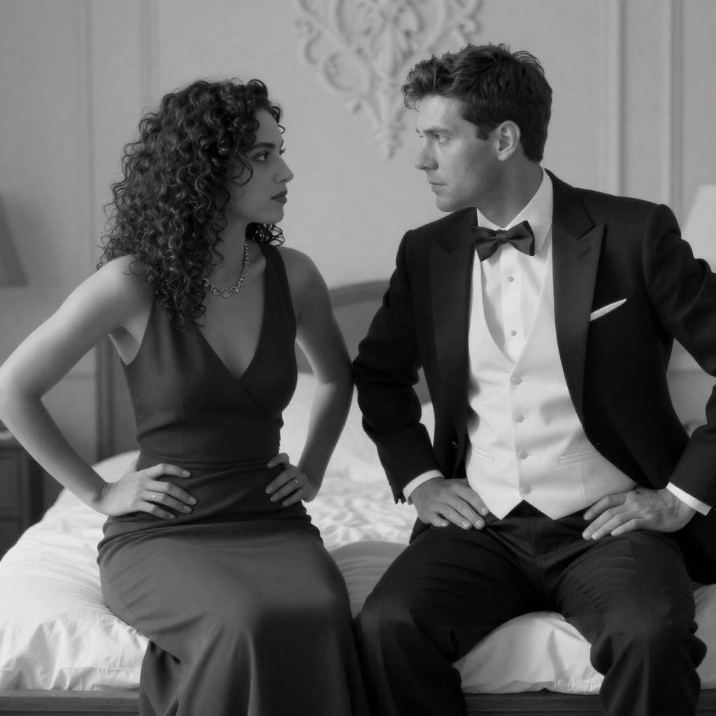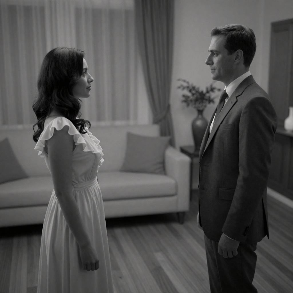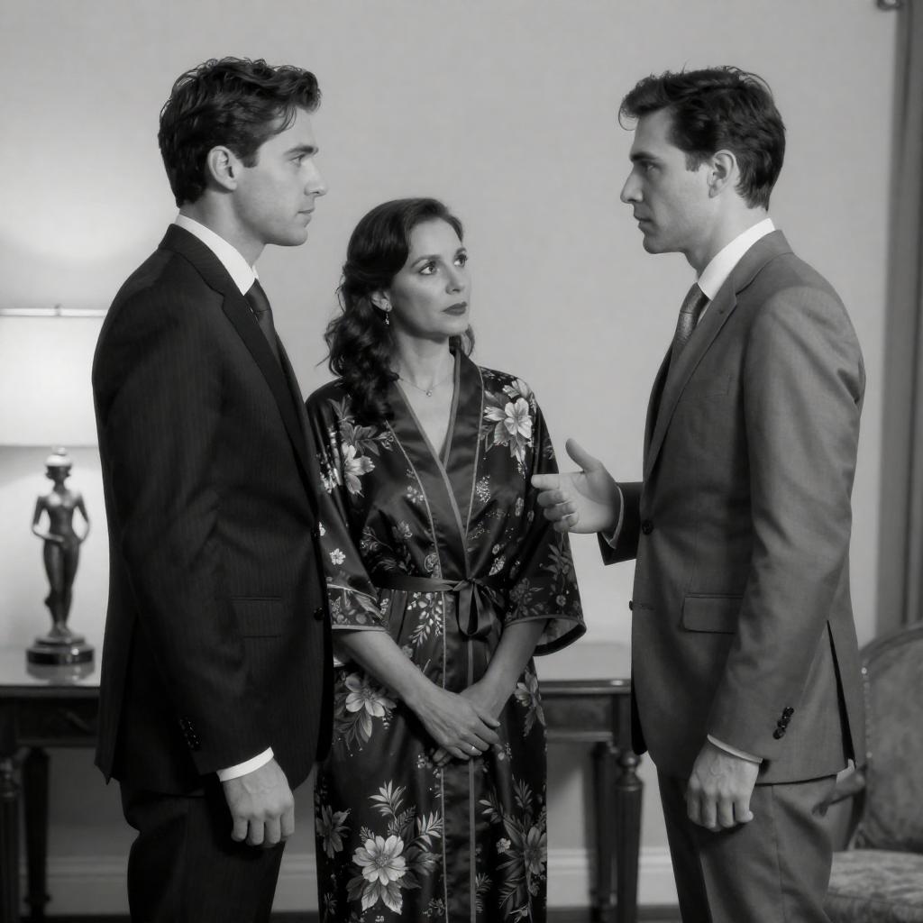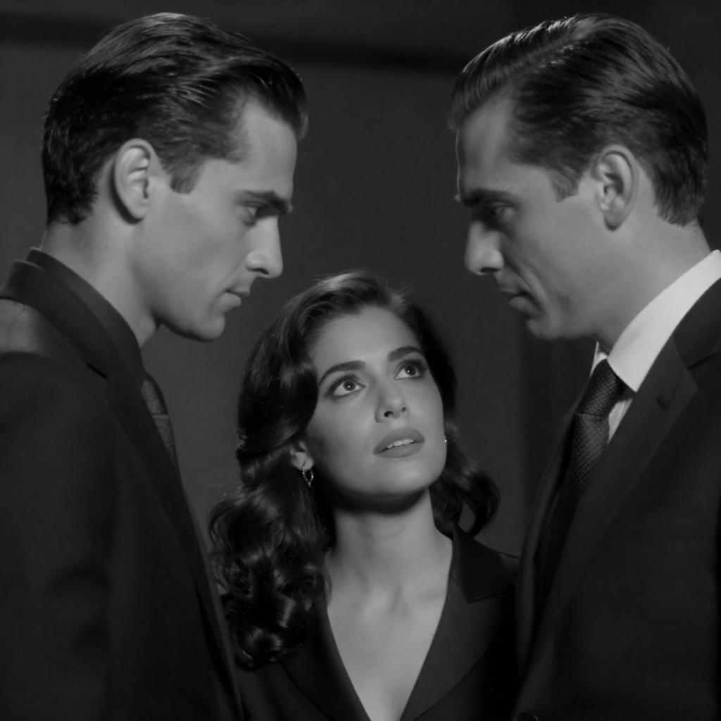 Black and white photograph of three people in a room. A man in a suit stands, looking at a woman in a dark dress. A man lies on a couch, looking up at the woman. Background includes curtains and a chair. Intense expressions on the standing man and the lying man.
