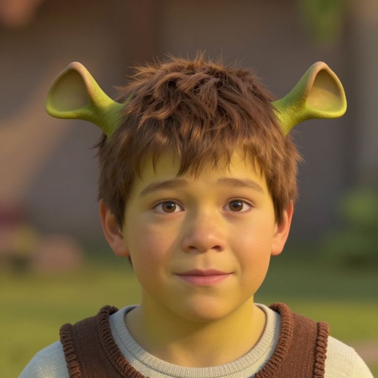 Photograph of a young boy with fair skin and brown, slightly tousled hair wearing green, elf-like ears on his head. He has large, dark brown eyes and a gentle smile. He is dressed in a white shirt with a brown knitted vest over it. The background is softly blurred, featuring green grass and indistinct, warm-toned foliage, suggesting an outdoor setting. The lighting is natural, with a warm, golden hue, enhancing the boy's features and creating a cheerful, whimsical atmosphere. The image has a slight, magical, CGI-like quality.