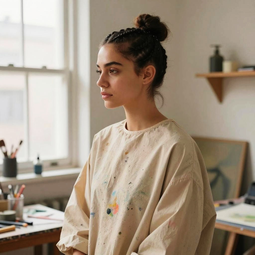Micro Braids hairstyle on female model, wearing edgy leather jacket, in contemporary art museum, captured in fashion editorial style with soft studio lighting.
