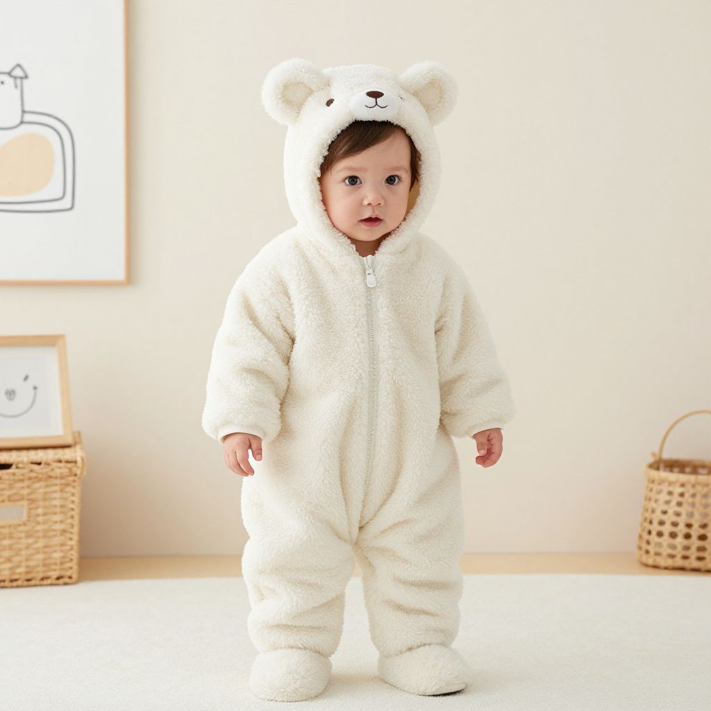 Photograph of a baby in a fluffy white bear onesie with ears, standing in a bright, minimalist room with wicker baskets.