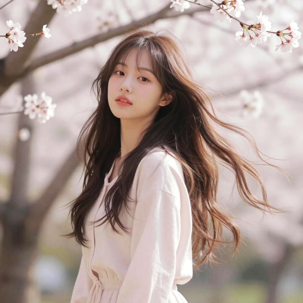 Artistic painting of a female with Asian blond hair flowing in the wind, cherry blossoms falling around, soft pastel colors, impressionist style with ethereal lighting