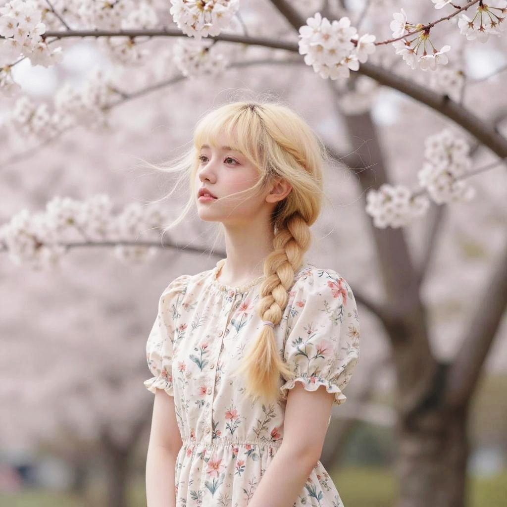Impressionist Asian Blonde with Cherry Blossoms