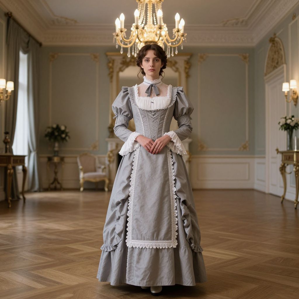 Photograph of a young woman in a Victorian-style grey dress with white lace trim, standing in an elegant, chandelier-lit room.