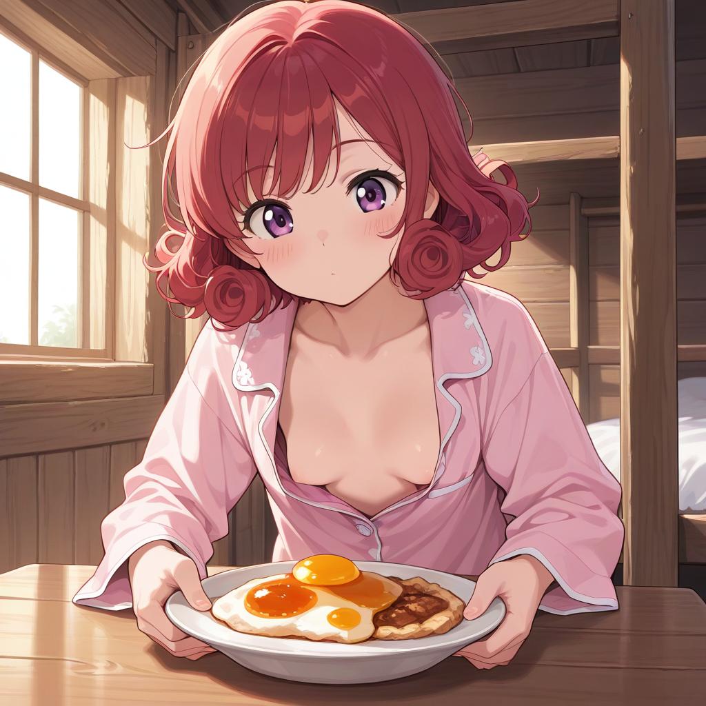 (masterpiece, best quality), 1girl, Carnation Side Swept Curls, tiny breasts, bunk bed, pajamas, looking out the big window, breakfast on table, wooden wall