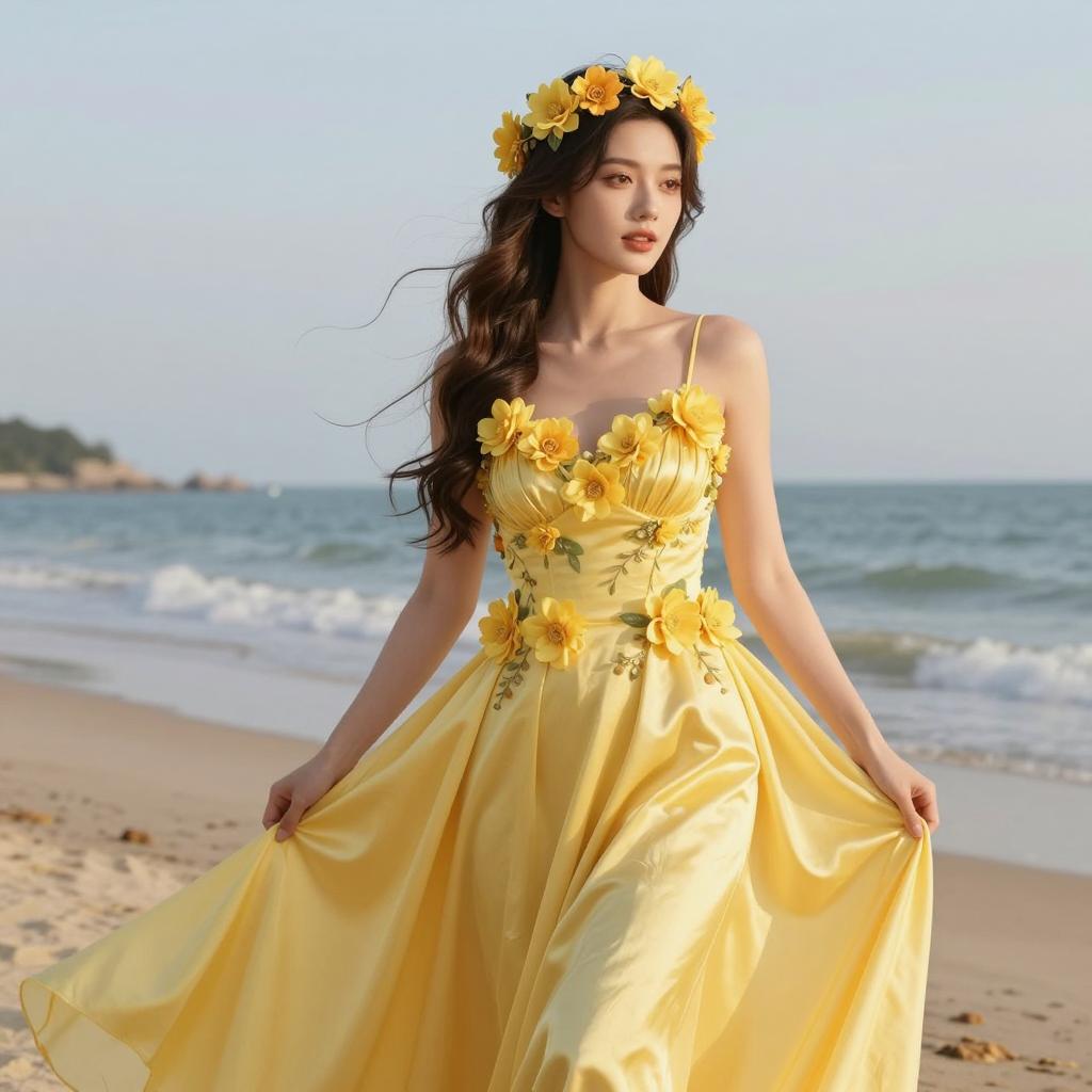 A stunning woman stands on a sunlit beach at golden hour, wearing a vibrant yellow satin gown adorned with floral details on the bodice and a matching flower crown. Her long, wavy hair flows gently as she holds the sides of her elegant skirt, creating a serene and radiant beach portrait.