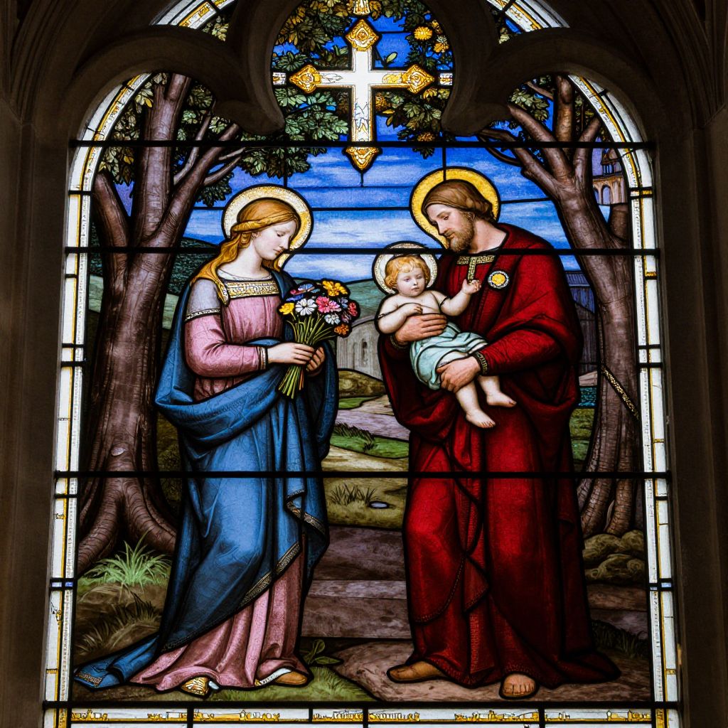 Stained glass window depicting Mary in blue robe, holding flowers, and Joseph in red robe, cradling baby Jesus, with a cross above,