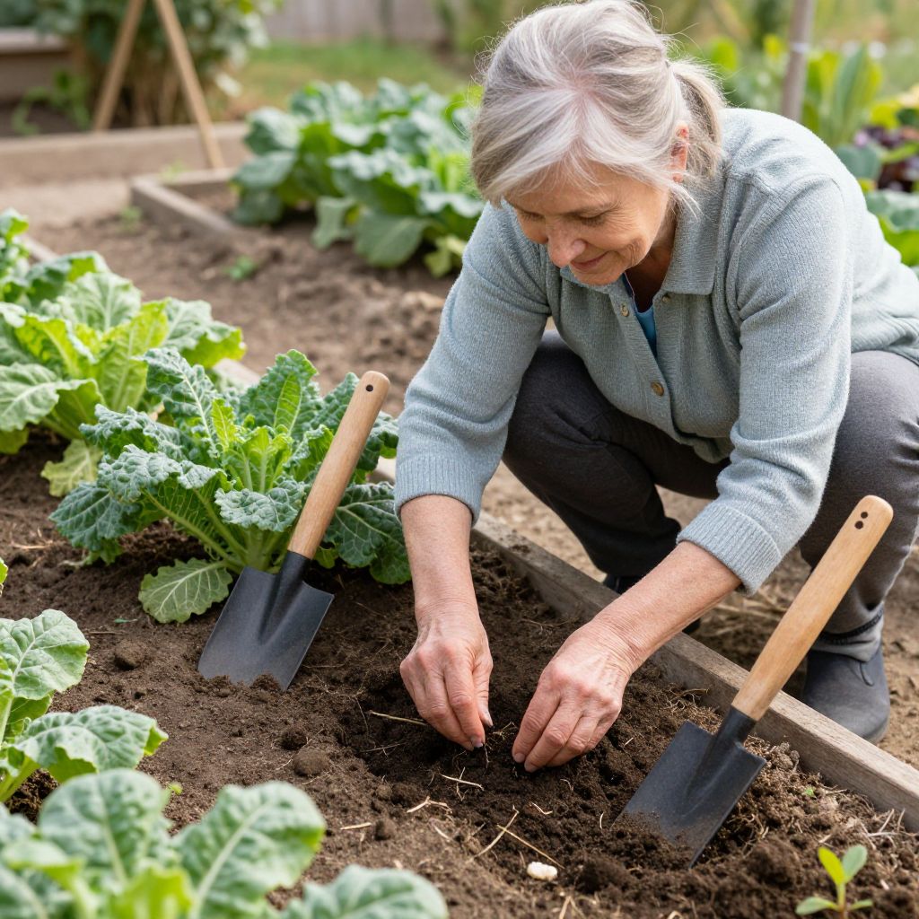 Nurturing elderly woman planting seeds in a sun-dappled vegetable garden, rustic setting with wooden tools and fresh soil, soft sunlight highlighting her gentle smile, detailed foliage and earth textures, intimate and hopeful mood.