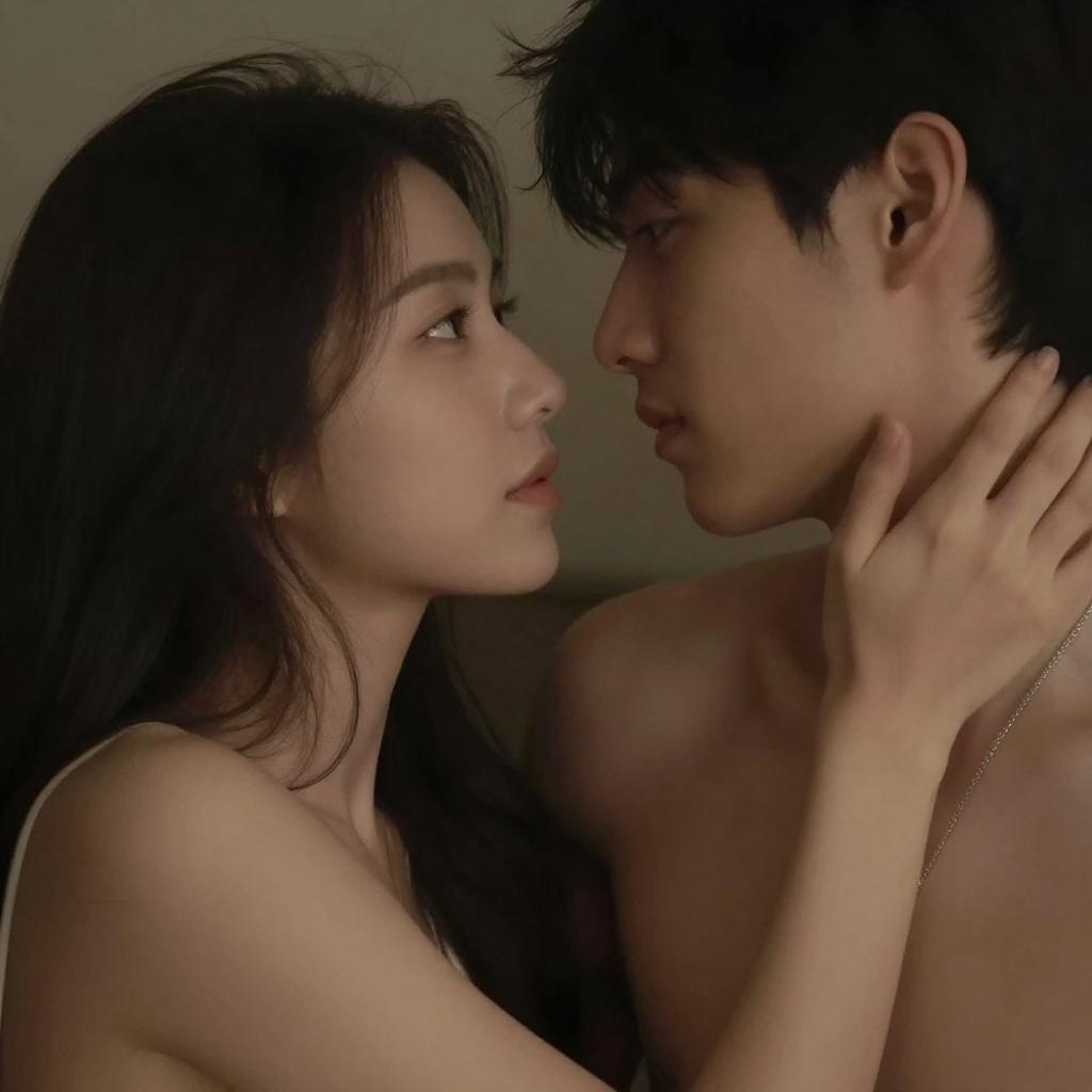 Photograph of a couple in an intimate embrace. The woman, with long brown hair, wears a red lace bra and matching thong, her fair skin glowing softly. The man, shirtless with short dark hair, holds her close. The camera angle is slightly above eye level, capturing their upper bodies. Soft natural light highlights their skin, with a shallow depth of field that blurs the background.