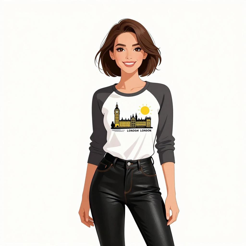 Woman with pretty face and pretty hair. smiling Woman, casual, graphic long-sleeve T-shirt with 'London' theme, scoop neck, color-blocked with white torso and gray sleeves, photo and text print, paired with black faux-leather pants, skinny fit, mid-rise waist. --sref 1467