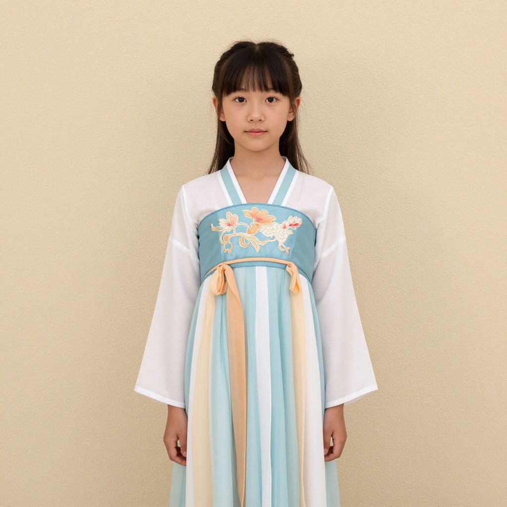 Photograph of an East Asian girl standing against a plain, light beige wall. She has straight, dark brown hair with bangs, and is wearing a traditional Korean hanbok. The hanbok features a white top with long sleeves, and a light blue bodice adorned with an embroidered white and pink dragon. The skirt is a combination of vertical light blue and white stripes, with a pale orange ribbon tied at the waist. Her expression is neutral, and she is positioned centrally in the image, facing the camera. The background is simple and unobtrusive, emphasizing the hanbok's intricate details.