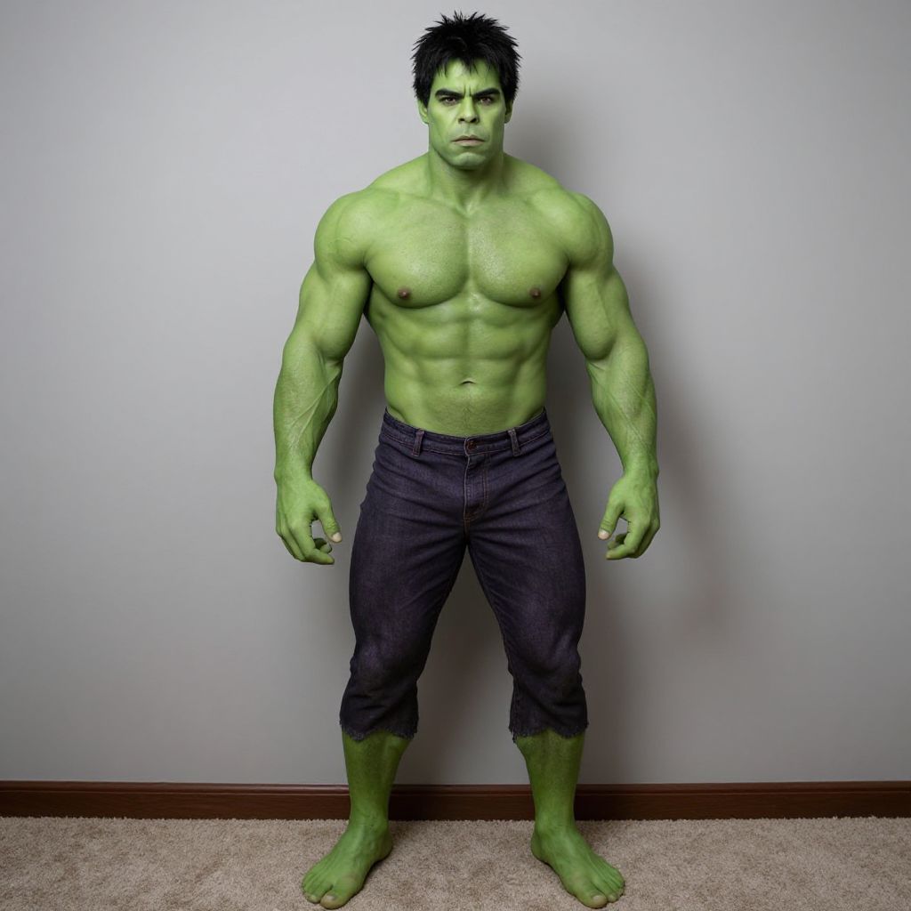 Photograph of a muscular, green-skinned man with black hair, wearing dark pants, standing against a plain white wall, and beige carpet.