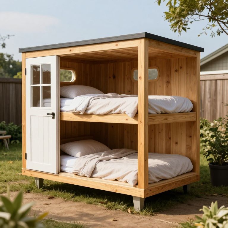 Modern wooden bed frame featuring a slide-out under-bed storage drawer with a light blue cushioned interior, positioned on a light wood floor with a textured beige rug nearby.