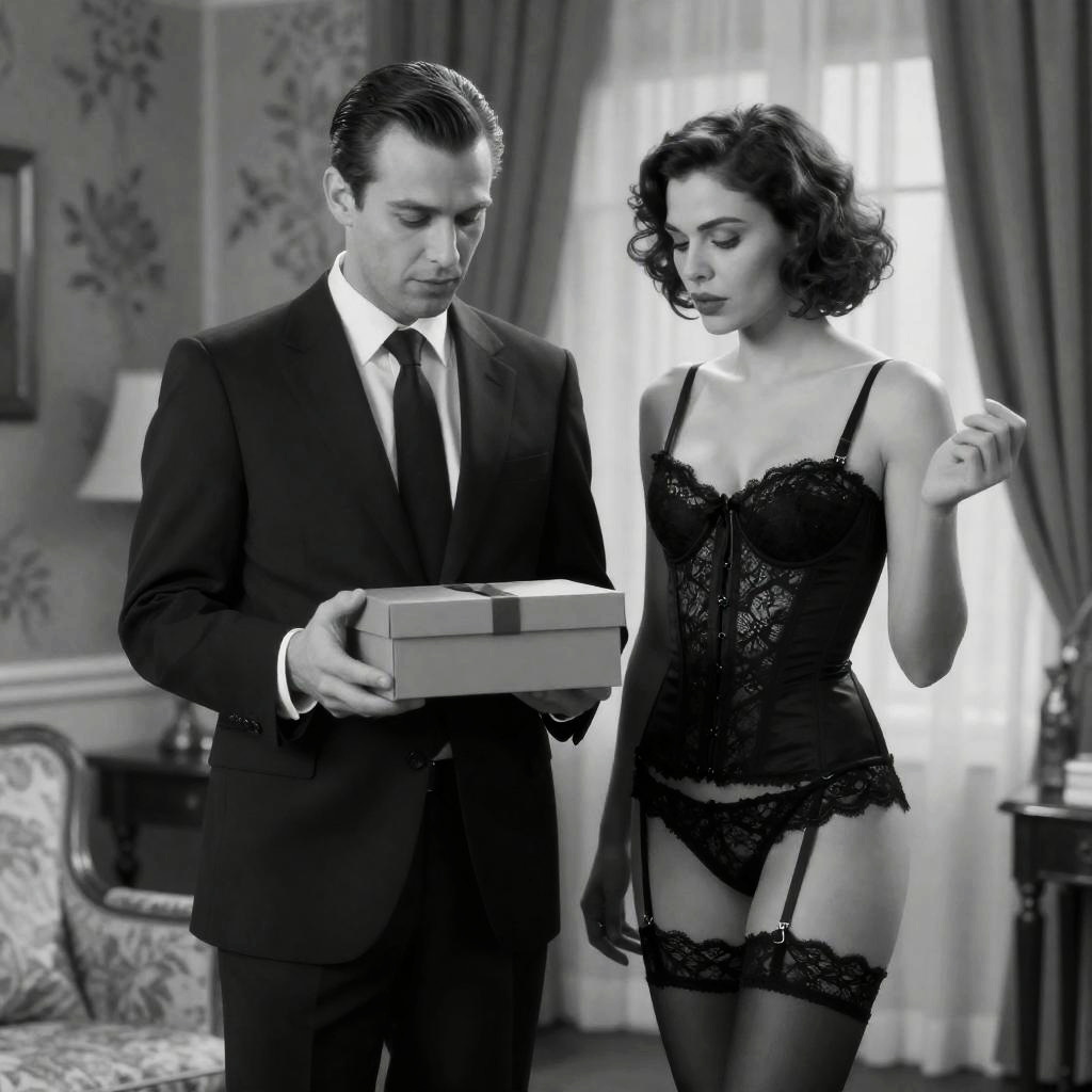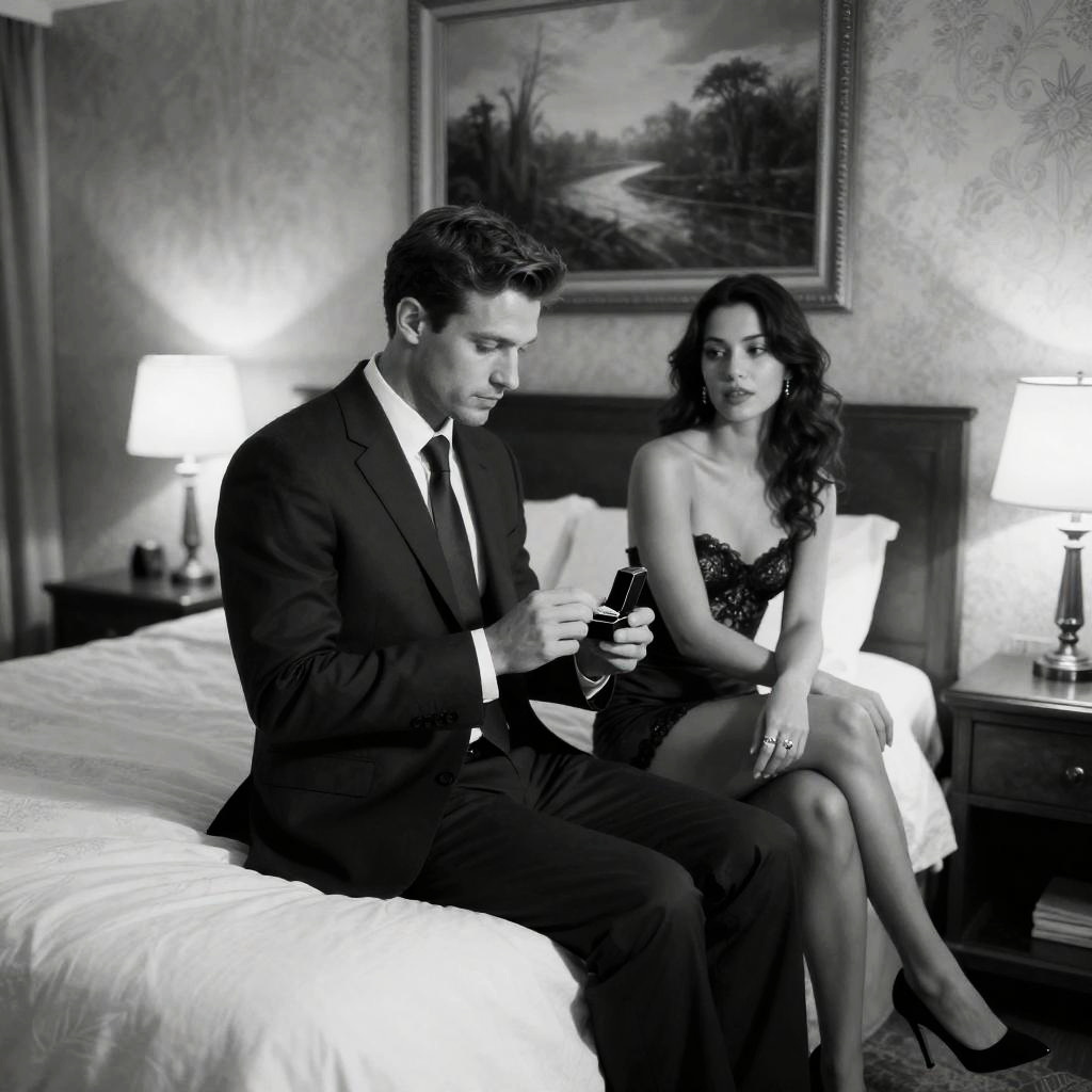 Black-and-white photograph of a man and woman in a bedroom. Man in dark suit holding a ring, woman in lacy strapless top and black high heels, sitting on a bed with patterned wallpaper and framed painting in background. Man's focused expression, woman's relaxed look. Lamp on bedside table.