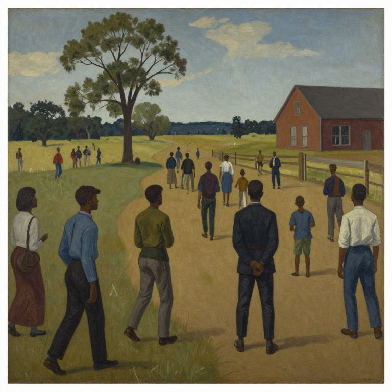 This is a photograph-like painting of a rural scene depicting a group of people walking on a dirt path through a grassy field. In the foreground, diverse individuals, including men and women of various ages and ethnicities, are dressed in mid-20th century attire. The men wear shirts and pants, while the women wear skirts and blouses. A red-brick barn stands to the right, with a large tree to the left. In the background, more people are scattered across the field, and a wooden fence runs parallel to the path. The sky is blue with scattered clouds, and the overall color palette is warm and earthy.