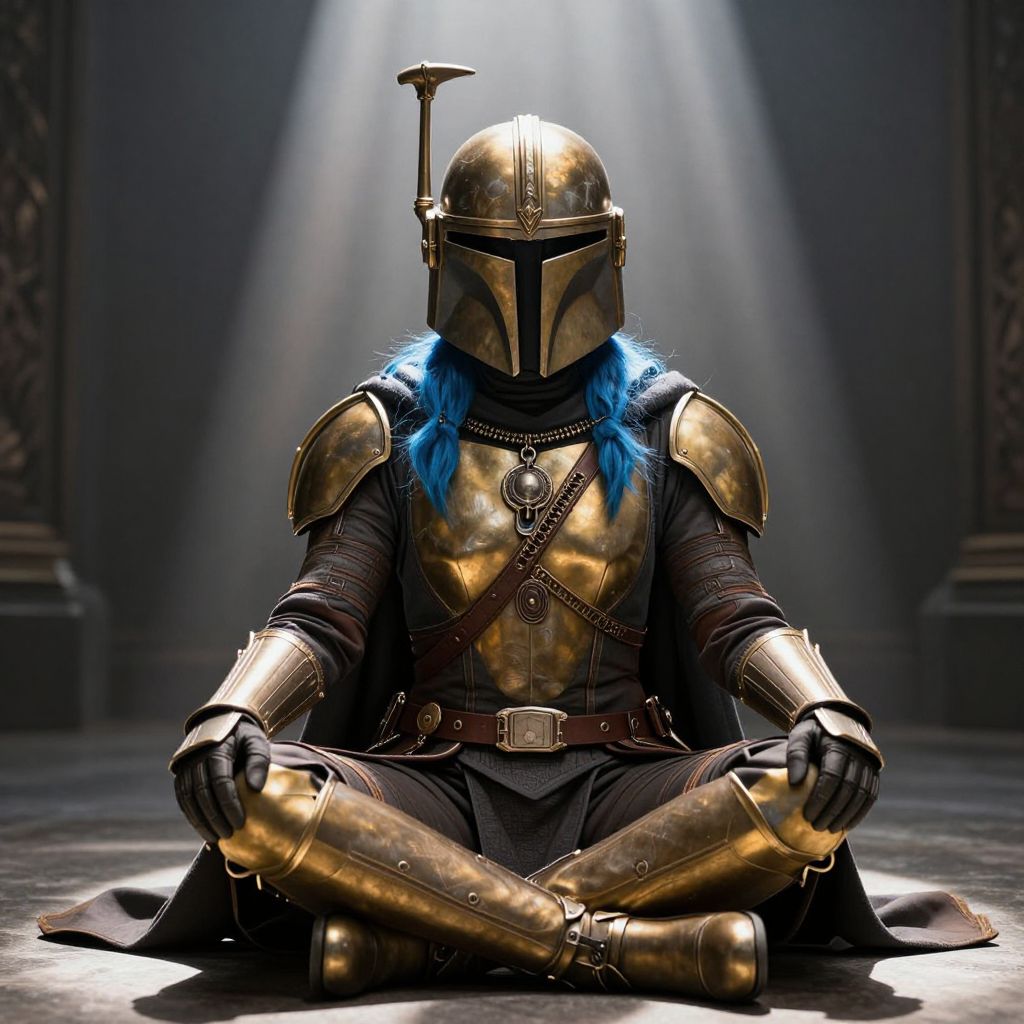 In the image, a woman dressed in a detailed Mandalorian armor is depicted in a full lotus position, with her legs crossed and hands resting on her knees. She wears a full helmet with a facemask, adorned with intricate designs and a prominent horn-like protrusion on top. Her armor is a mix of gold and dark colors, with a chain necklace adding to her regal appearance. The background is dimly lit, with a shaft of light filtering through, creating a dramatic and mysterious atmosphere. The woman's vibrant blue hair contrasts with the metallic tones of her armor, adding a touch of color to the otherwise monochromatic scene. The overall composition is balanced, with the woman centrally positioned and the light source behind her, casting soft shadows and highlighting the textures of her armor.