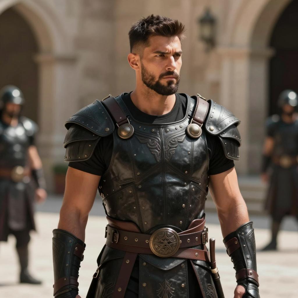 Muscular man with short black hair and beard stands in the center, wearing armored chest plate with gold stripes, dark tunic, and holding a wooden staff. Background: cloudy, orange sky, stone amphitheater with arches, crowd at bottom. Man's expression is determined. Image has a digital, cinematic style.